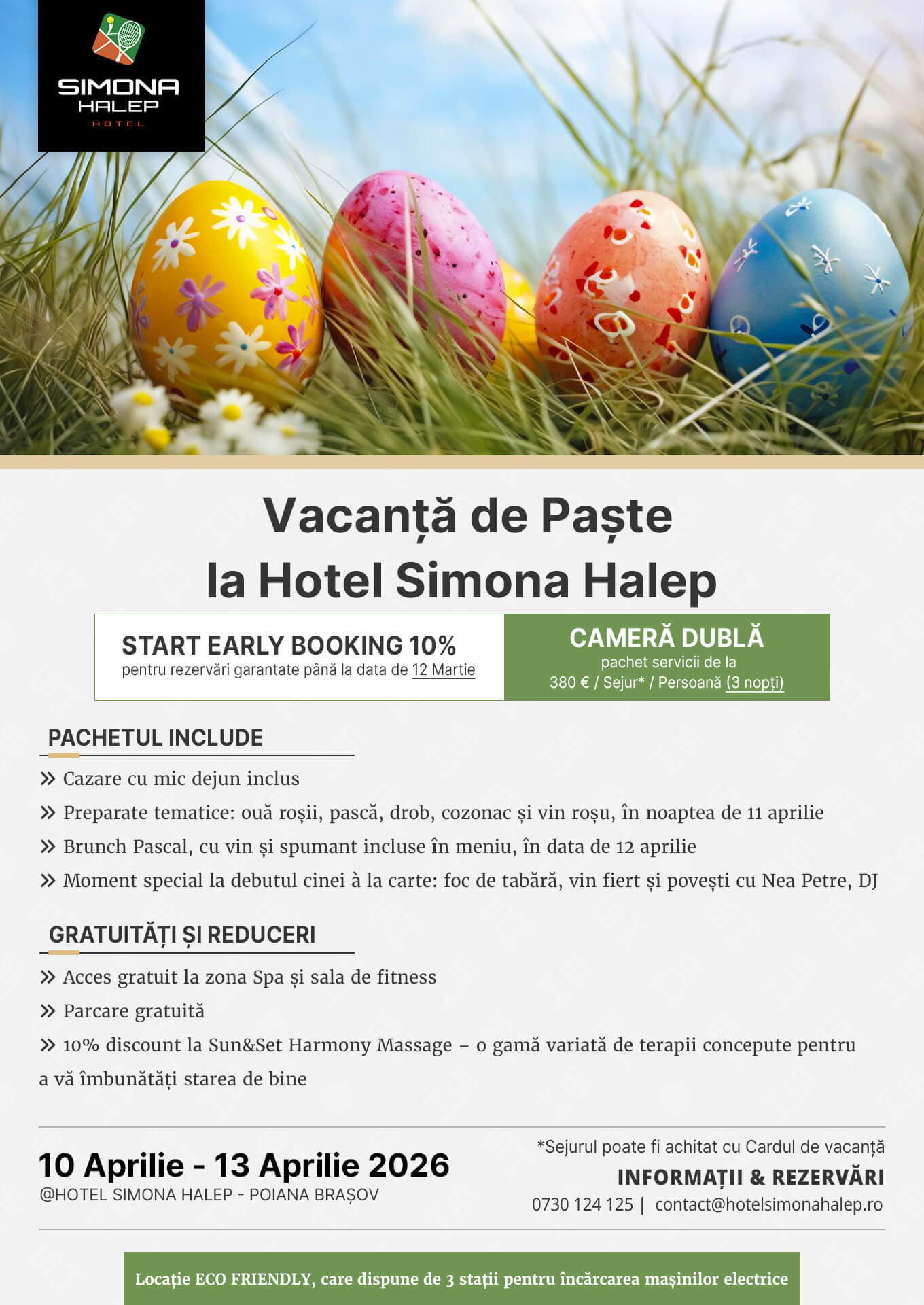 În prag de primăvară, când Poiana Brașov își recapătă tihna și muntele respiră liniște, Paștele la Hotel Simona Halep devine o invitație la rafinament, tradiție și bucurii trăite pe îndelete. . Te așteptăm într-un refugiu elegant, unde diminețile încep domol, cu mic dejun inclus, arome proaspete și priveliști care îți dau timp să te reconectezi cu tine și cu cei dragi.